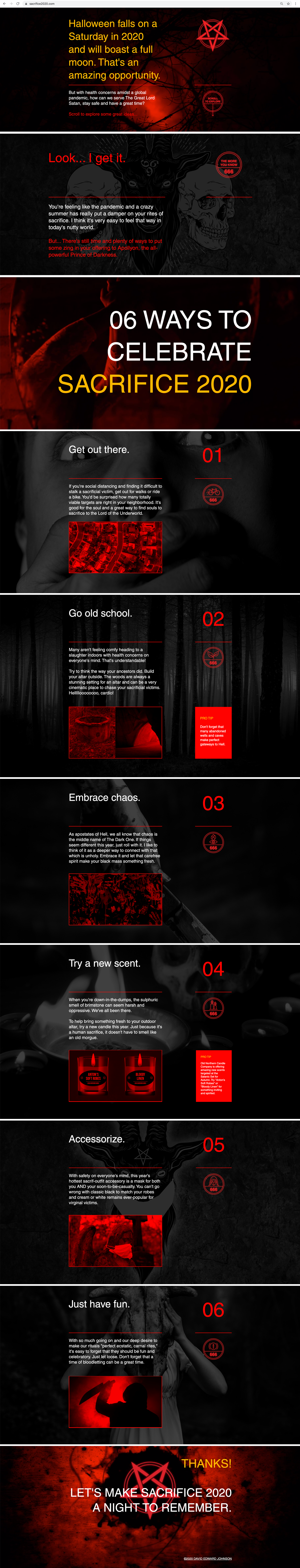 Halloween night is on a Saturday in 2020. ANNNND, it’s a full moon. Jeez. How can we let THAT go unnoticed. Thinking of that made my mind jump to black-robed horror film full moon rites of sacrifice. I thought it would be really funny to lampoon our influencer “life hack” culture while paying homage to those 60s satanic fright films I grew up shuddering to. I give you “SACRIFICE2020.COM.”